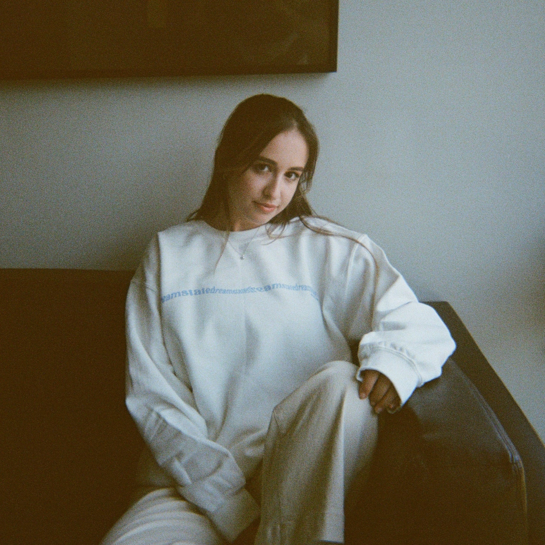 “Dreamstate” artwork printed on 50/50 cotton/polyester basic lightweight crewneck in colour white.